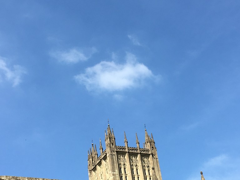 A cloud puff hovers above the spectacular cathedral at Wells, home to bishops for eight centuries.