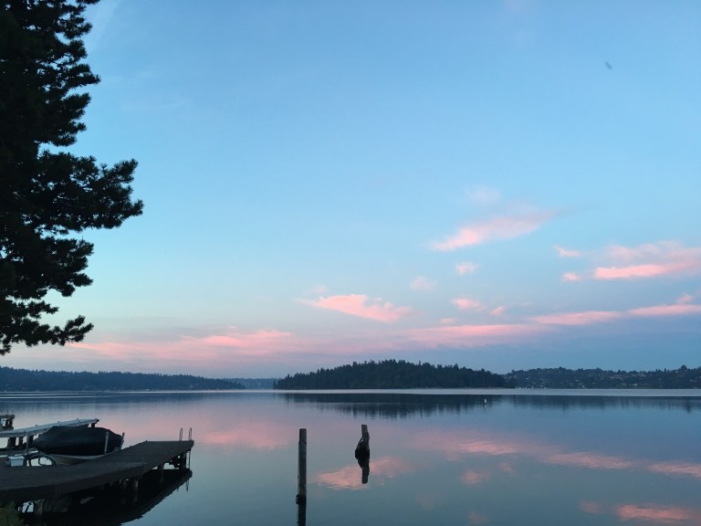 Dawn breaks over Mercer Lake, Washingon, as Seattle wakes up on the opposite shore.