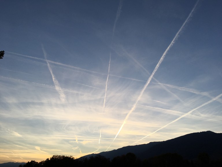 Last rays of light reflected on jet trails, clear crisp autumn sunset.