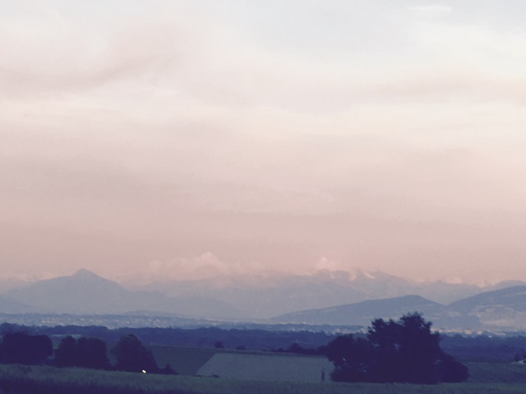 A pink wash of clouds and mountains at dusk, the air heavy with late spring heat and humidity. Perfect for a stroll.