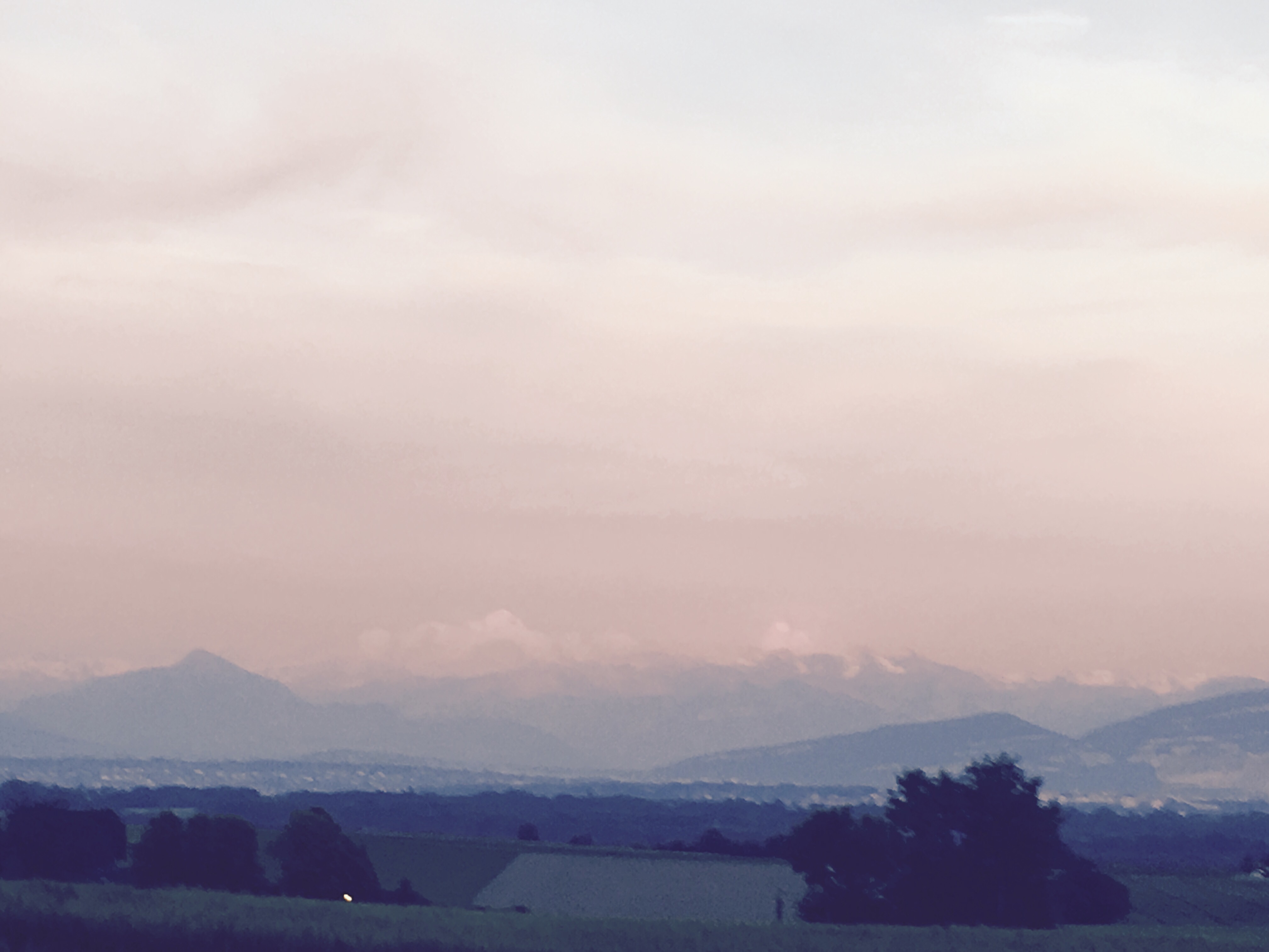 A pink wash of clouds and mountains at dusk, the air heavy with late spring heat and humidity. Perfect for a stroll.