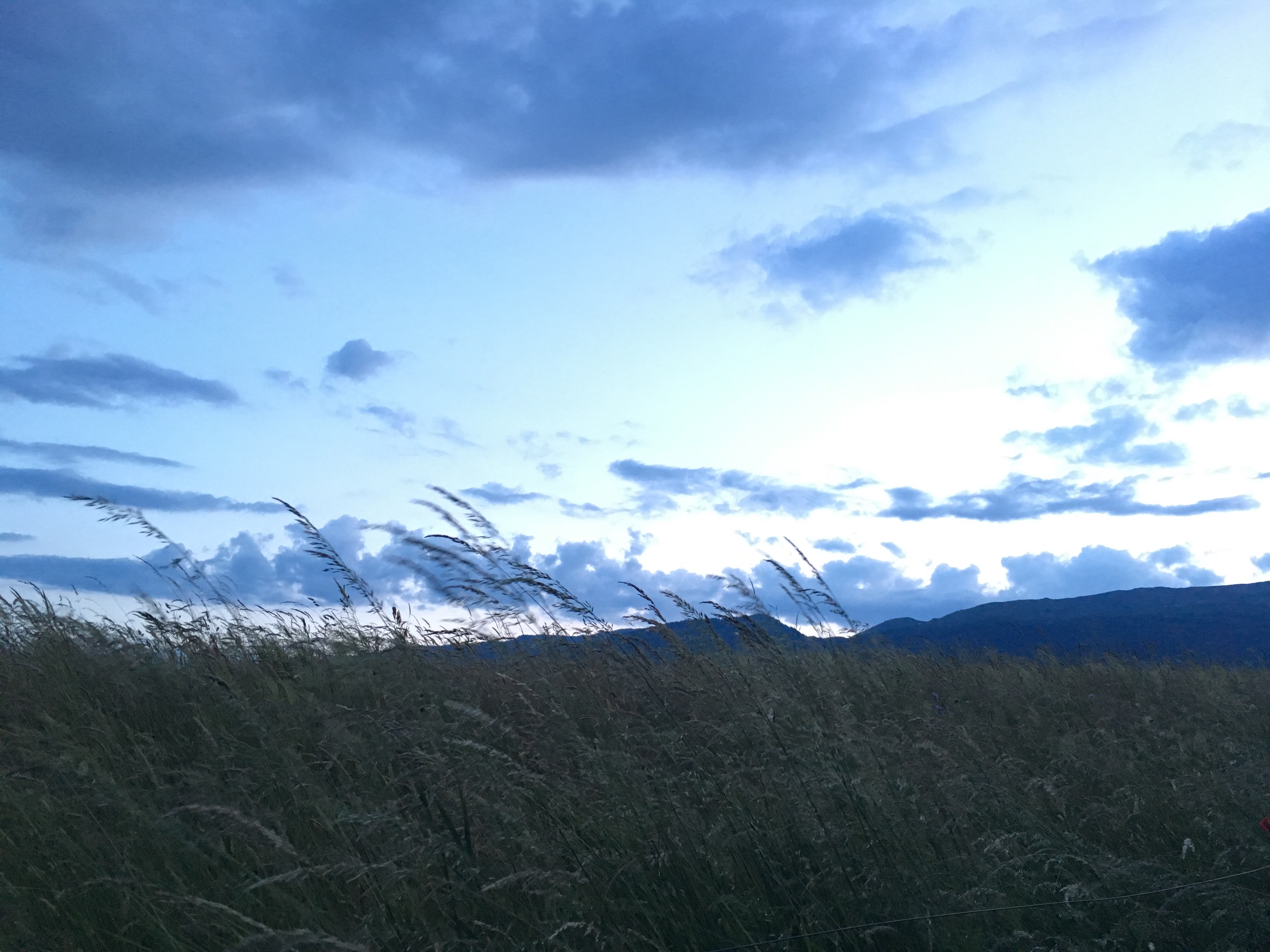 A warm, breezy spring evening waiting for a storm to roll in with welcome rain.